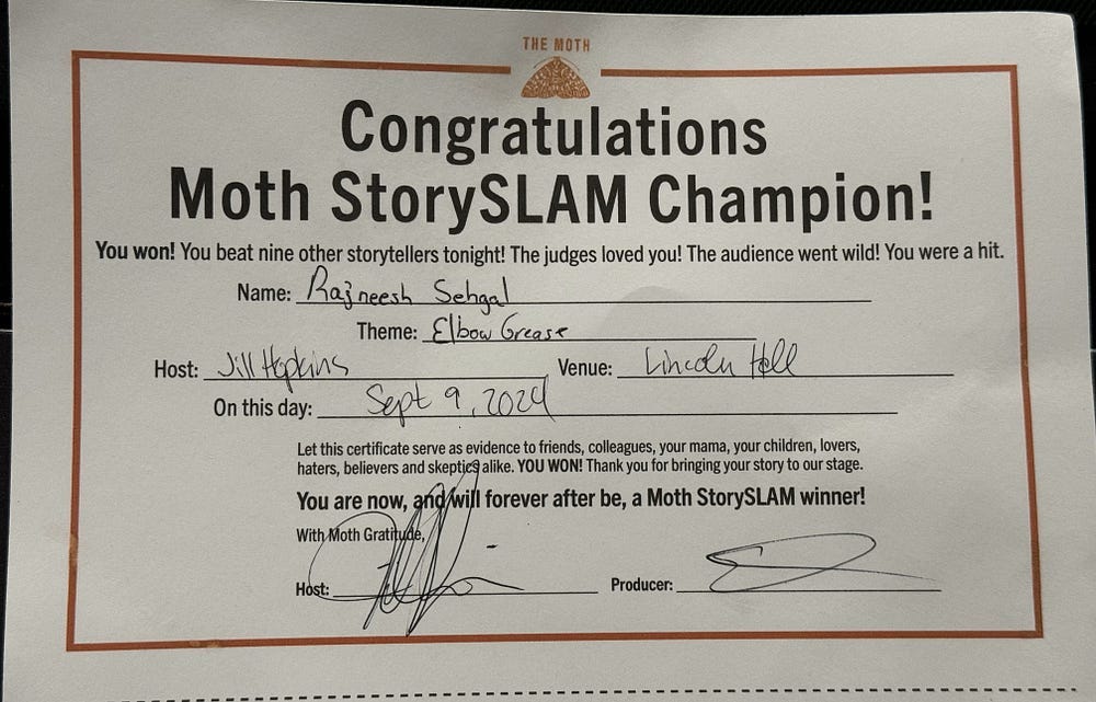 I am humbled and thrilled to share that I won The Moth StorySLAM on Monday at Lincoln Hall in Chicago. This is my second win at The Moth, and I couldn’t be more grateful. The night's theme was “ELBOW GREASE,” and I shared a humorous story about my journey into DIY home improvement — let’s say it was a bit more challenging (and comical) than expected!